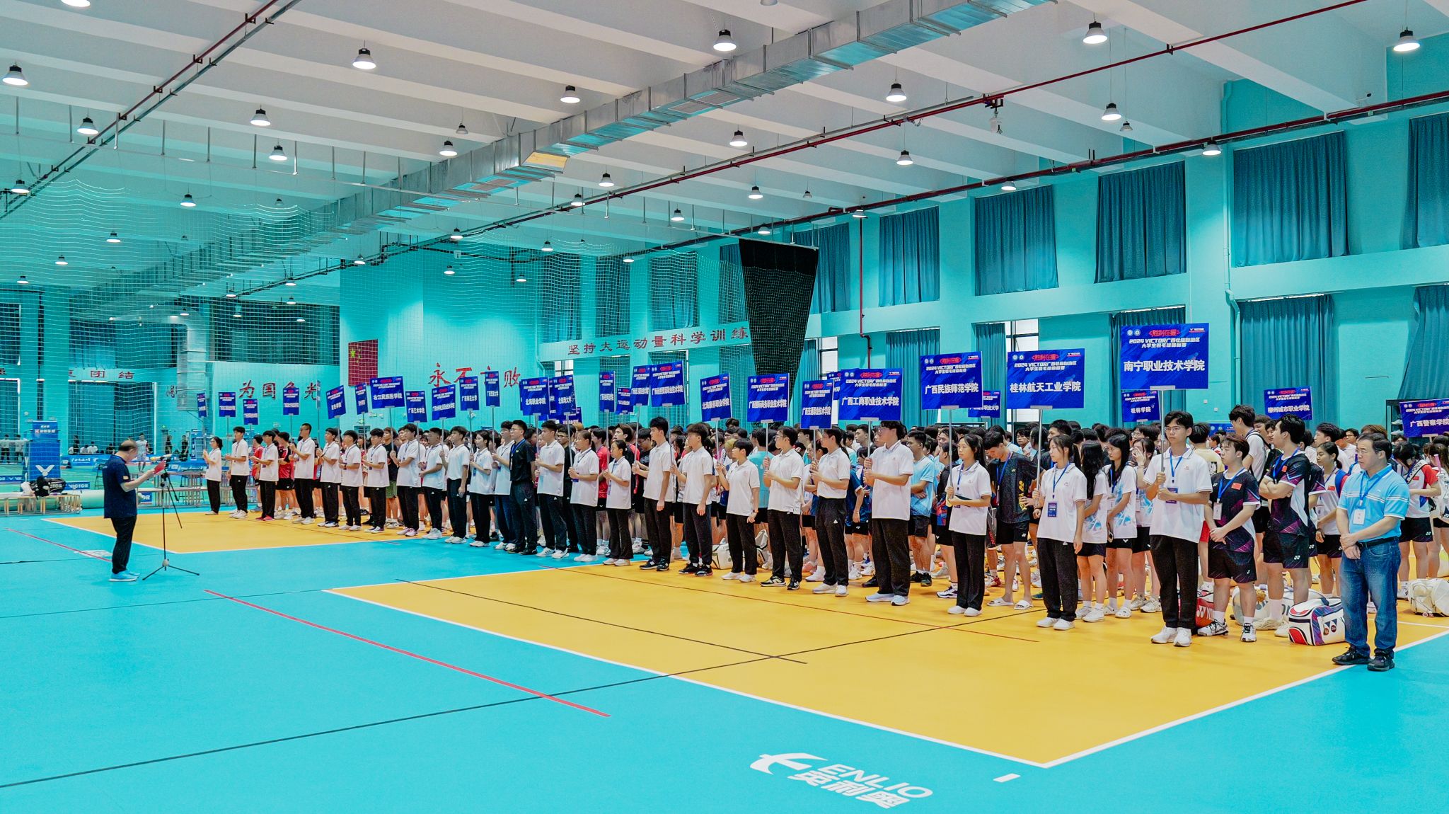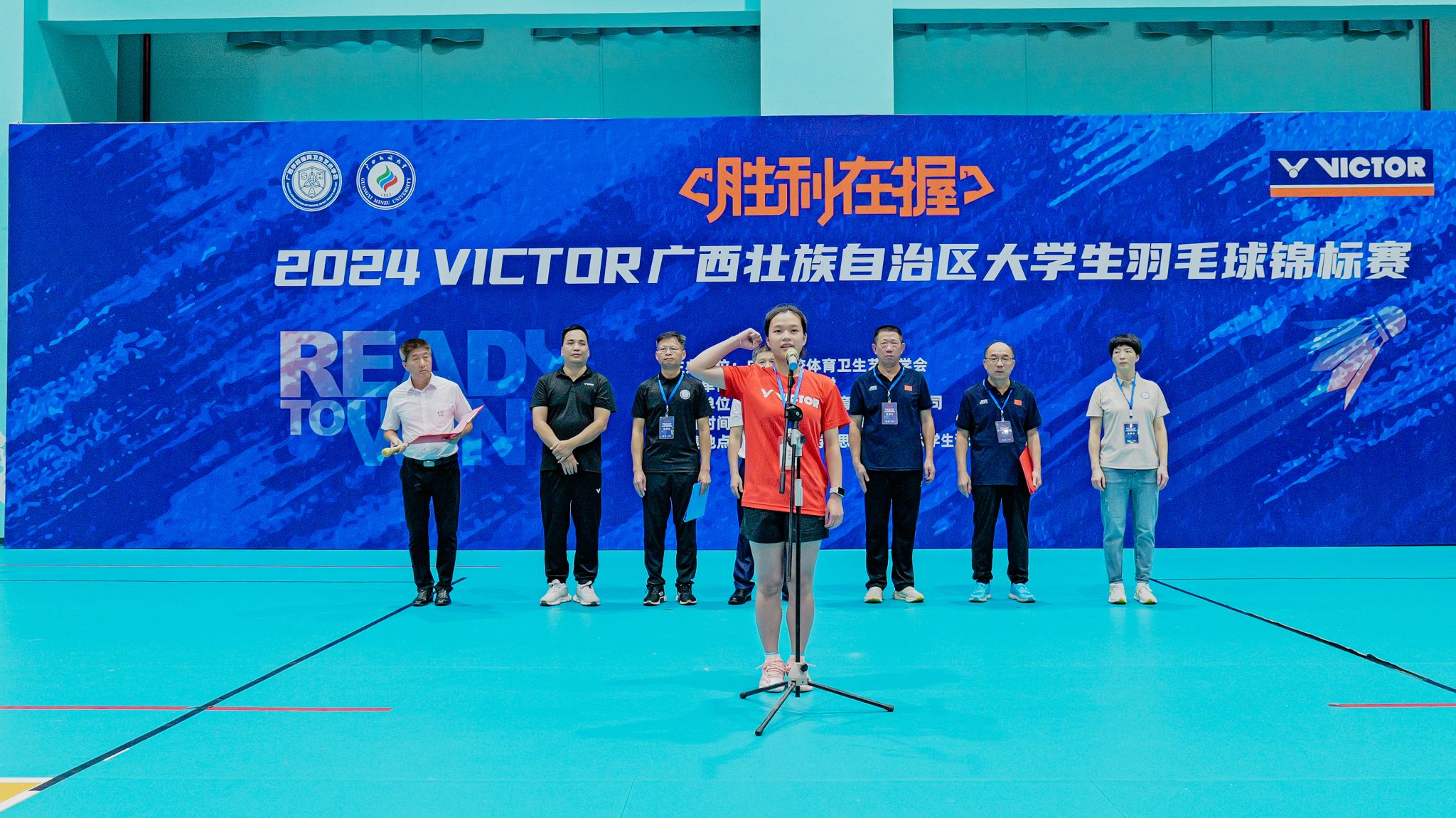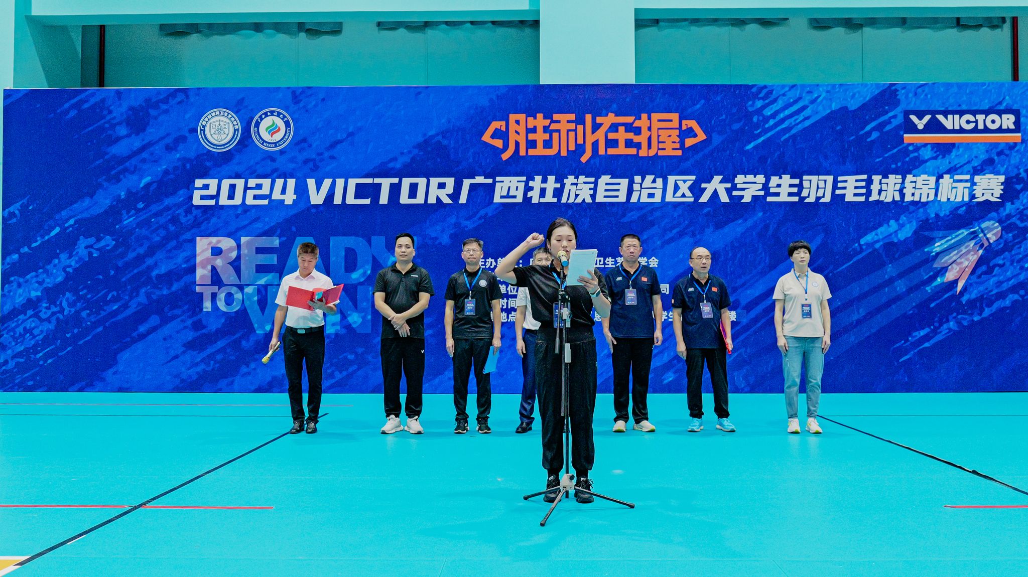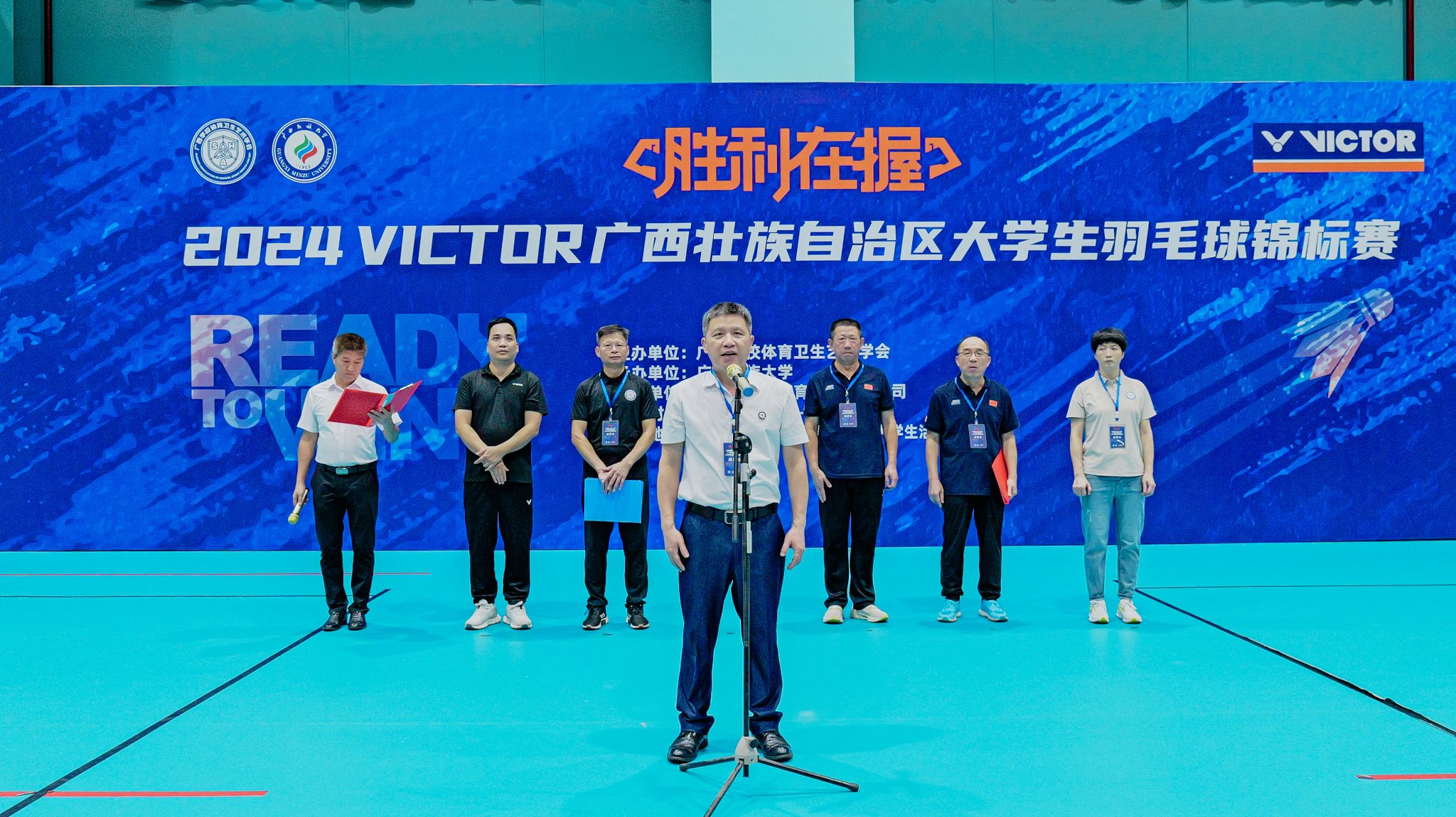 2024年6月10日上午,2024VICTOR广西壮族自治区大学生羽毛球锦标赛开幕式(后简称VICTOR大羽赛)在我校思源湖校区大学生活动中心举行。广西民族大学党委常委、副校长吕俊彪,广西学校体育卫生艺术学会会长、广西民族大学体育与健康科学学院院长蒋东升,广西学校体育卫生艺术学会常务副会长、广西中医药大学体育部主任李荣源,广西民族大学体育与健康科学学院党委书记张九凯,广西学校体育卫生艺术学会副秘书长徐小荷,广西民族大学体育与健康科学学院副院长吴先源、吴健俊,江苏维克多体育用品有限公司、广西及粤西南区域总经理伍绍柏,本次赛事裁判员、工作人员及各高校参赛队伍等出席开幕式。开幕式由体育与健康科学学院吴健俊副院长主持。