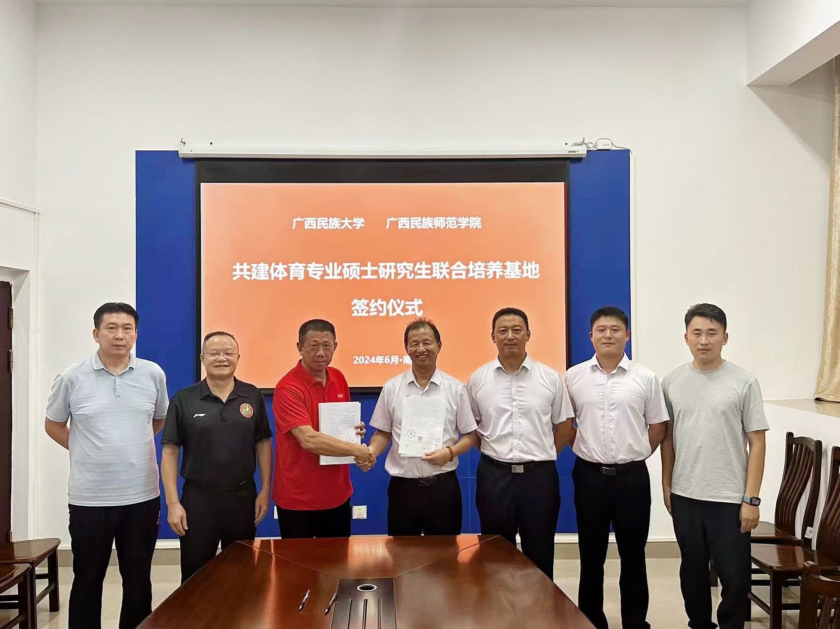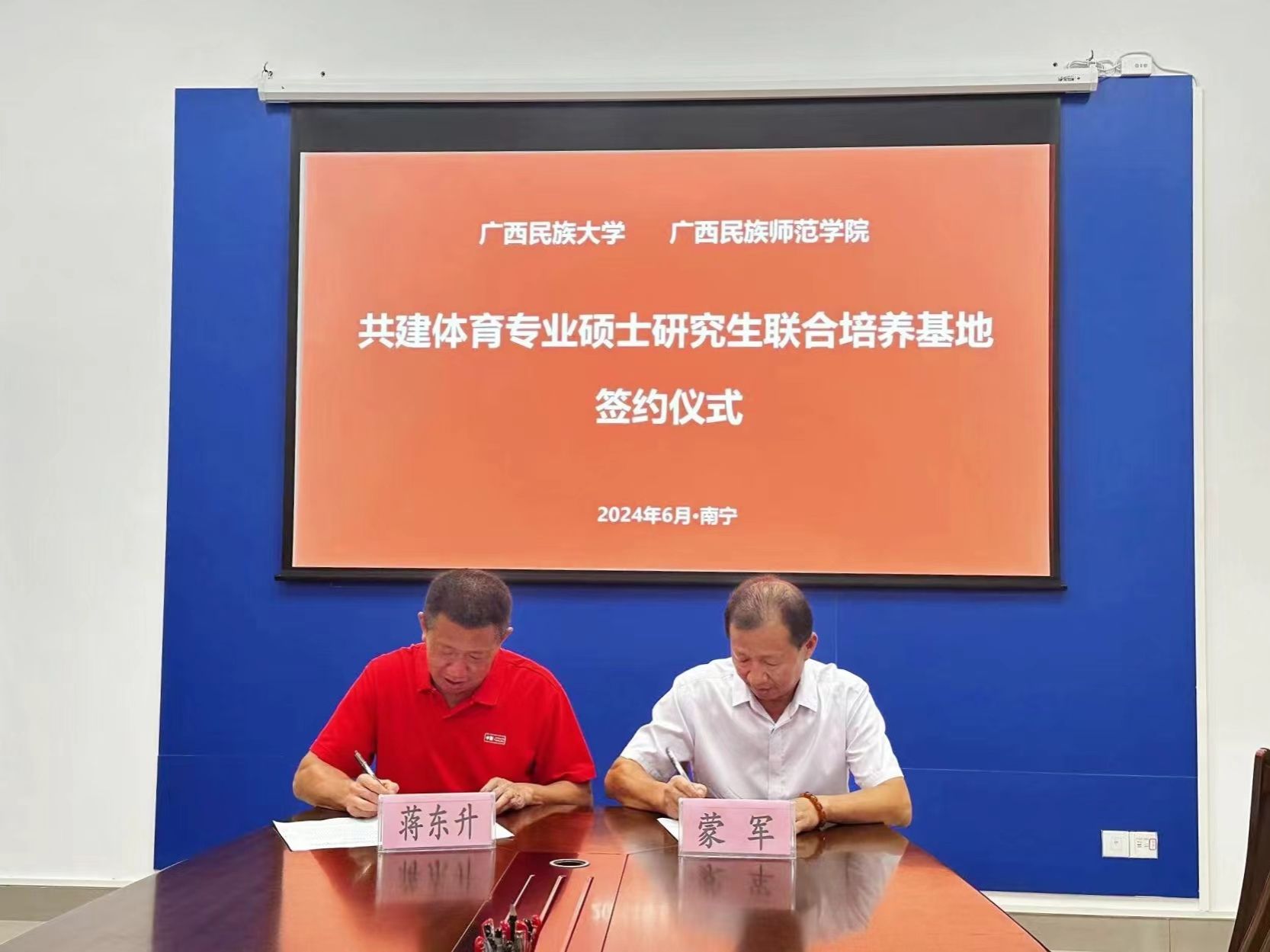 随后,在双方的见证下,蒋东升、蒙军共同签署广西民族大学与广西民族师范学院共建体育硕士研究生联合培养基地协议书。