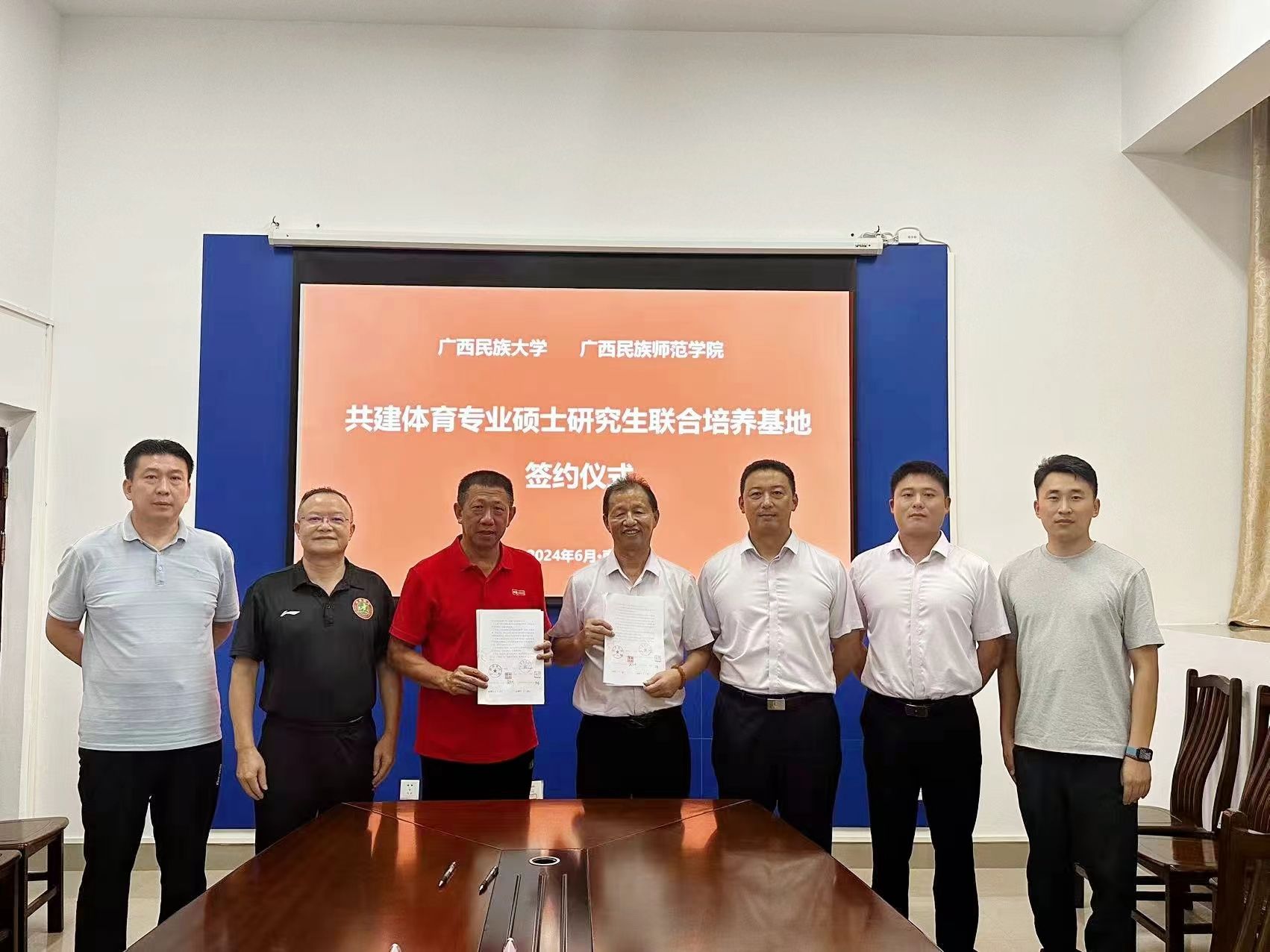 6月12日下午,我院与广西民族师范学院体育学院举行共建体育硕士研究生联合培养基地签约仪式。我院院长蒋东升,副院长吴先源、赵学森,研究生教学秘书唐元超,广西民族师范学院体育学院院长蒙军,党总支书记黄斌,副院长张兆龙,办公室主任邢荣鑫,教授周骞等参加签约仪式。