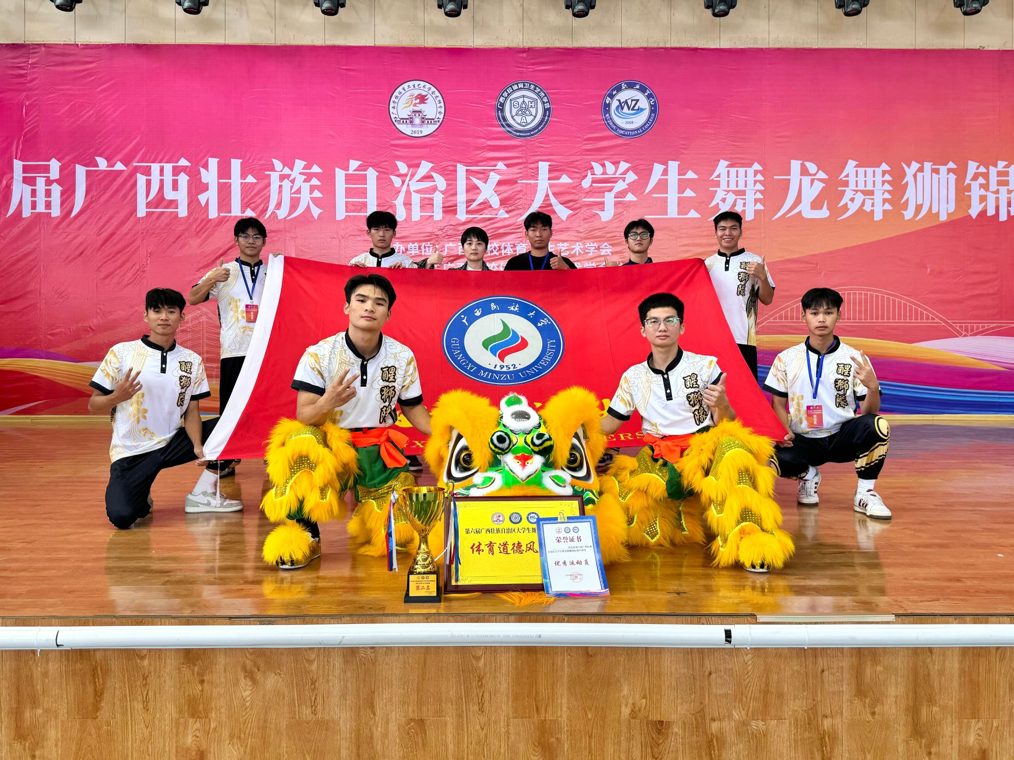 11月24日,第六届广西大学生舞龙舞狮锦标赛在梧州职业学院圆满落幕。我院龙狮队八位健儿充分展现出广西民族大学运动员的风采与实力,不畏强手,敢于挑战,不负嘱托,勇担使命,最终取得了男子传统南狮体育专业组第二名的好成绩!