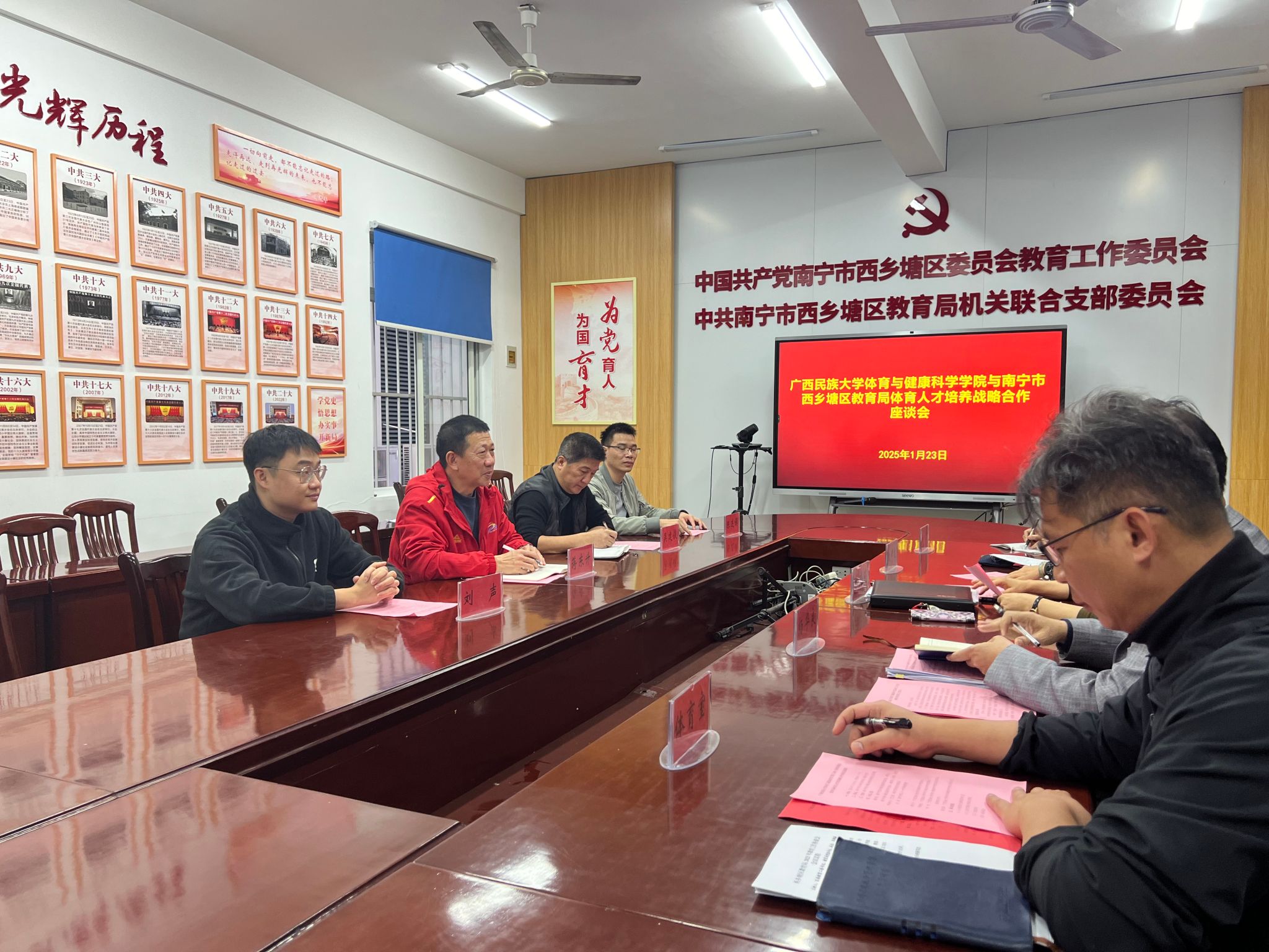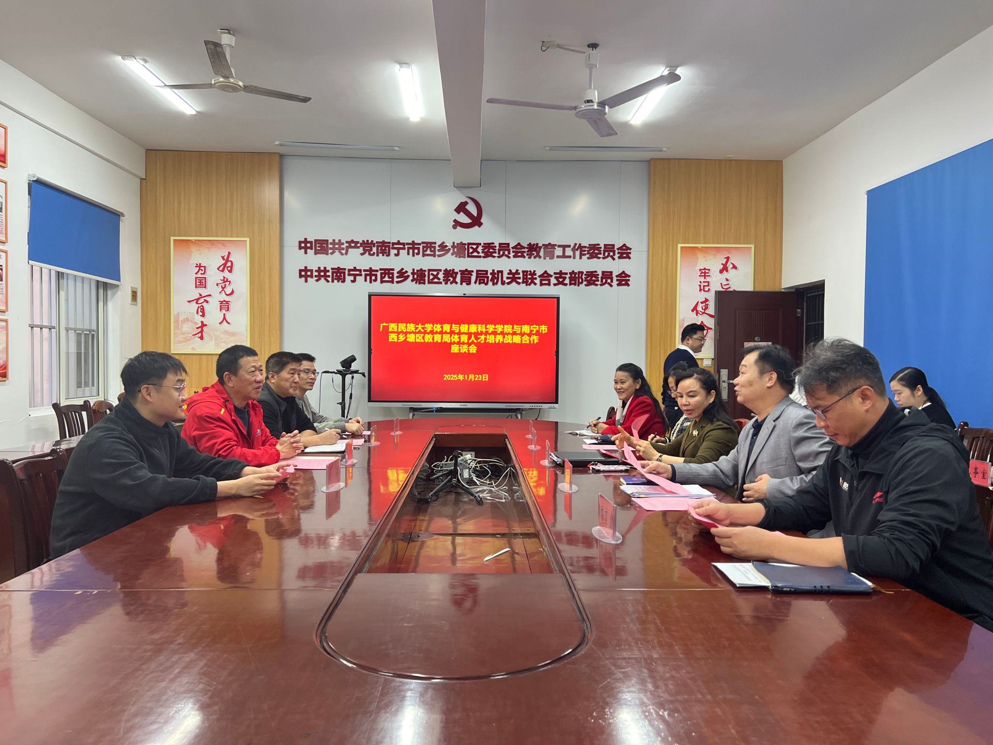 1月23日下午,体育与健康科学学院与南宁市西乡塘区教育局于西乡塘区教育局二楼会议室召开体育人才培养战略合作座谈会。西乡塘区教育局党组书记、局长乐晓薇,教育局党组成员、副局长杨华良,教育局行政办、教研室、体育室等股室负责同志,体育与健康科学学院院长蒋东升,副院长吴健俊,教师刘声、陈述保参与会议。
