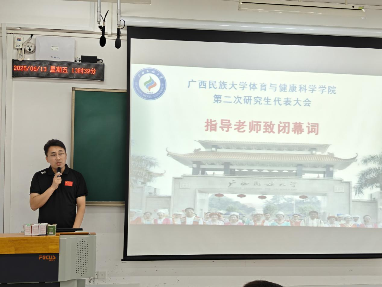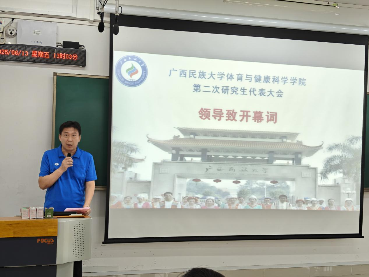 体育与健康科学学院副院长赵学森教授致开幕辞,他充分肯定上一届研究生会在学术实践、校园文化、服务社会等领域的突出贡献,并对新一届成员提出期望,要求全体代表强化政治引领、深化服务创新、优化队伍建设,以高度的责任感做好工作。