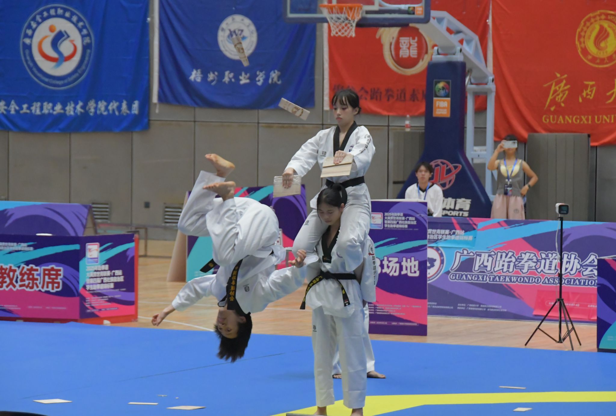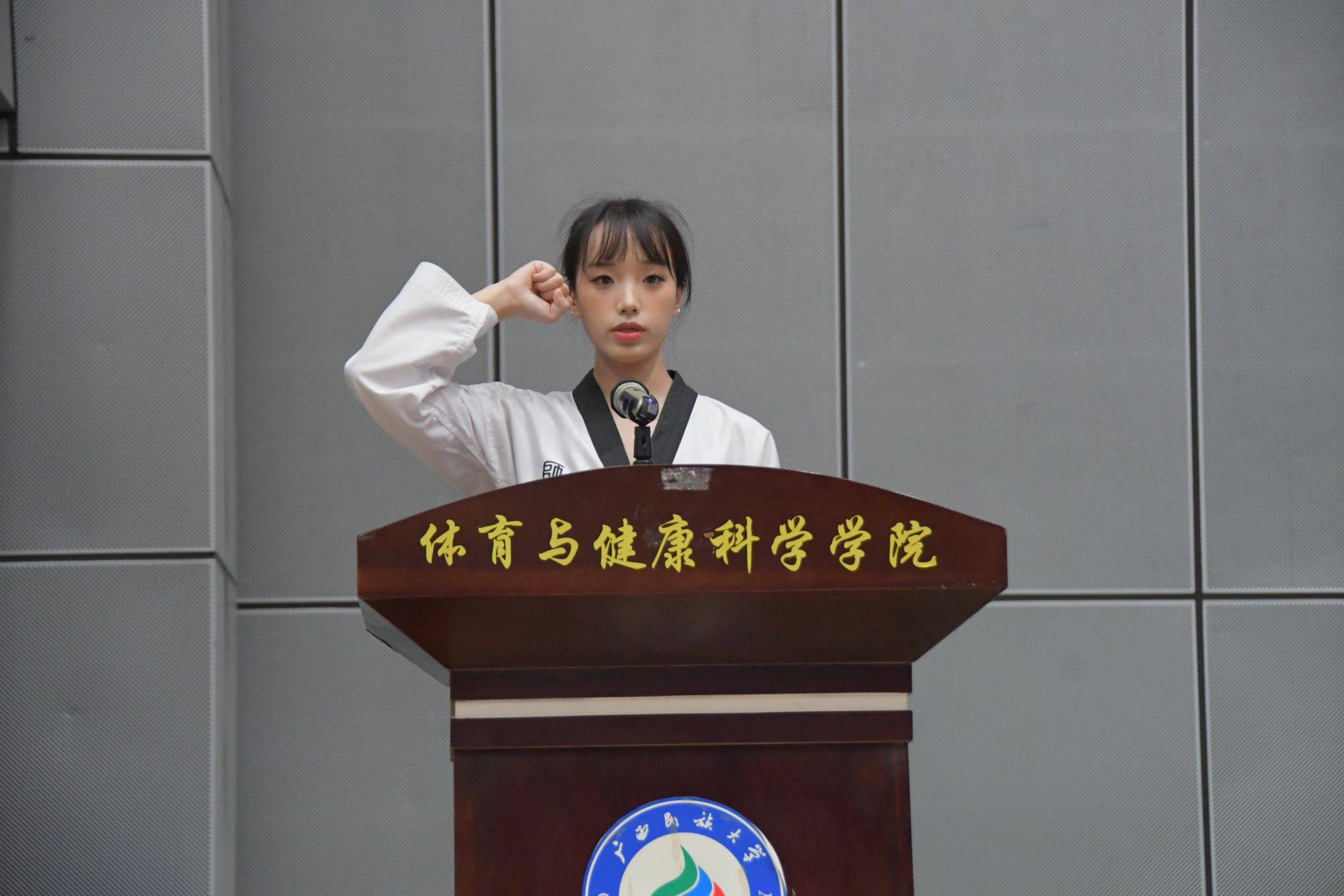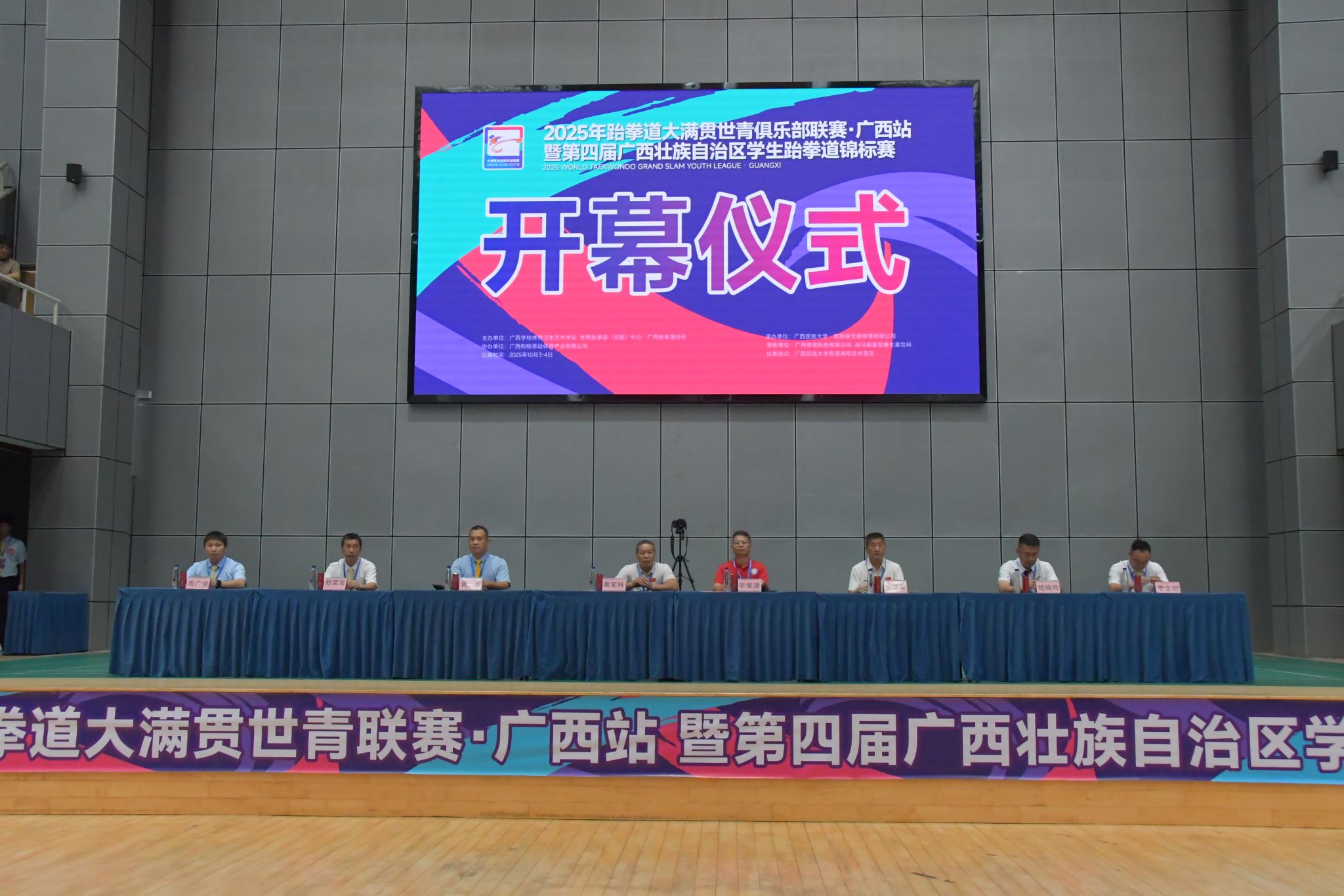 10月3日上午9时,2025年跆拳道大满贯世青联赛(广西站)暨第四届广西壮族自治区学生跆拳道锦标赛在广西民族大学思源湖校区隆重开幕。中国跆拳道协会执行委员、广西跆拳道协会代理主席黄奕科,广西学校体育卫生艺术学会常务副会长、广西中医药大学体育部主任李荣源,广西民族大学体育与健康科学学院副院长吴健俊,大赛相关技术代表、仲裁委员、裁判长以及全体教练员、运动员参加开幕式。