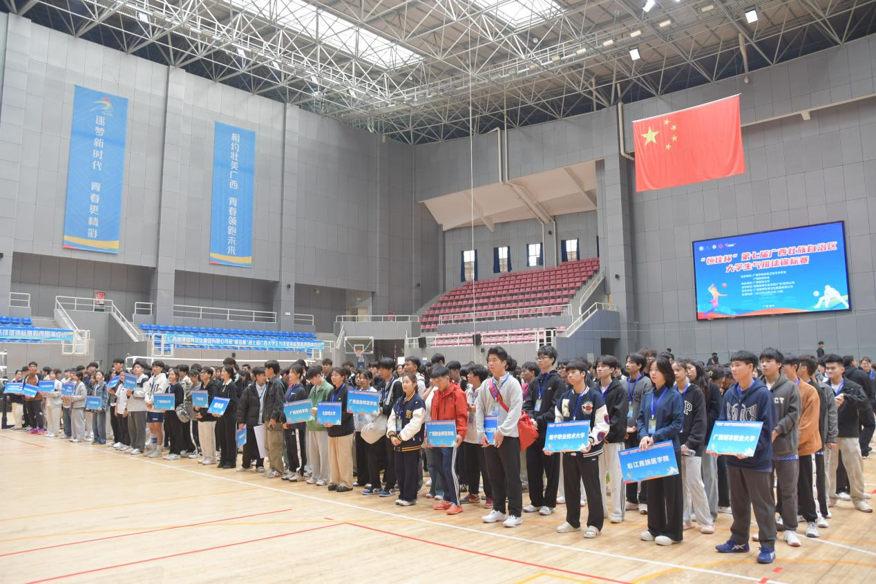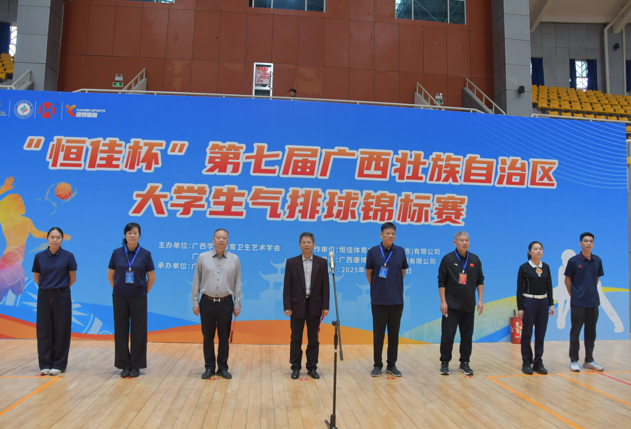 10月25日上午,“恒佳杯”第七届广西壮族自治区大学生气排球锦标赛在广西民族大学思源湖校区体育馆隆重开幕。广西学校体育卫生艺术学会常务副会长李荣源、广西排球协会主席廖秀南、广西民族大学体育与健康科学学院党委书记贺应魁、广西体育卫生艺术学会秘书长凌齐、广西排球协会秘书长陈惠卿、本届锦标赛裁判长李广华、滁州恒佳体育用品有限公司经理温晓琳、广西康博体育文化集团经理覃华杰,以及大赛相关技术代表、仲裁委员、裁判员和全体教练员、运动员共同出席了开幕式。开幕式由广西民族大学体育与健康科学学院副院长吴健俊主持。