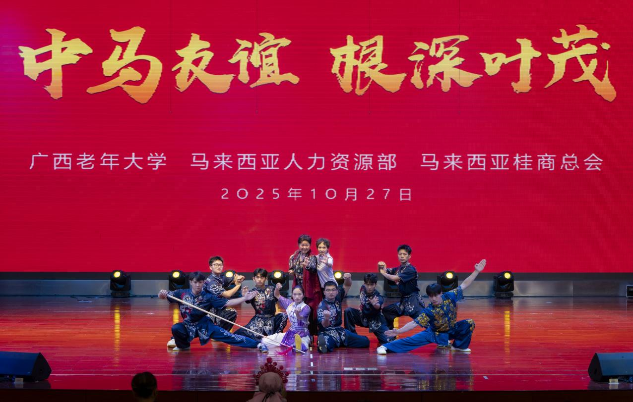 10月27日,为欢迎马来西亚人力资源部及马来西亚桂商总会代表,广西老年大学在凤岭校区隆重举办了“中马友谊 根深叶茂”文化交流演艺活动;随后,10月29日,由自治区党委老干部局与广西老年大学联合举办的广西第十三届“多彩金秋”文化活动也在同一校区圆满落幕。在这两场盛会中,我校青云武术队与广西老年大学携手合作,为观众奉献了融合文化底蕴与艺术美感的视听盛宴。