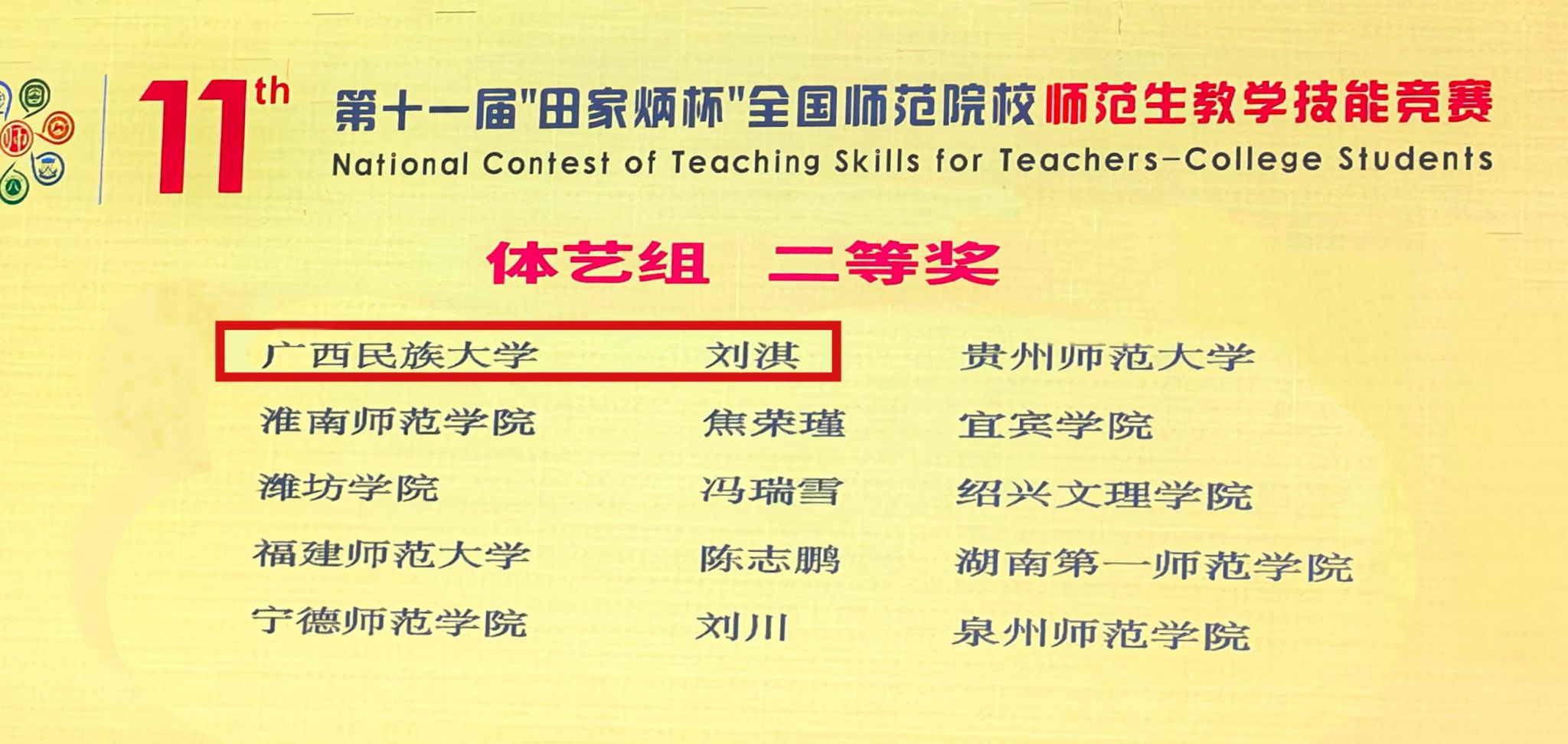 此次获奖,不仅是对刘淇同学个人努力与综合能力的充分肯定,也是我院坚持立德树人、深化教育教学改革、落实“以赛促学、以赛促教、以赛促改”人才培养机制的重要成果。展望未来,学院将持续以高水平赛事为平台,进一步强化师范生教学技能训练,不断提升人才培养质量,努力培养更多德智体美劳全面发展的高素质体育教育专业人才,为新时代体育教育事业贡献力量!(图文:王勇 陈安琪 初审:陈安琪 复审:时昌桂 终审:贺应魁 编辑:农旺 校对:黄丽珠)