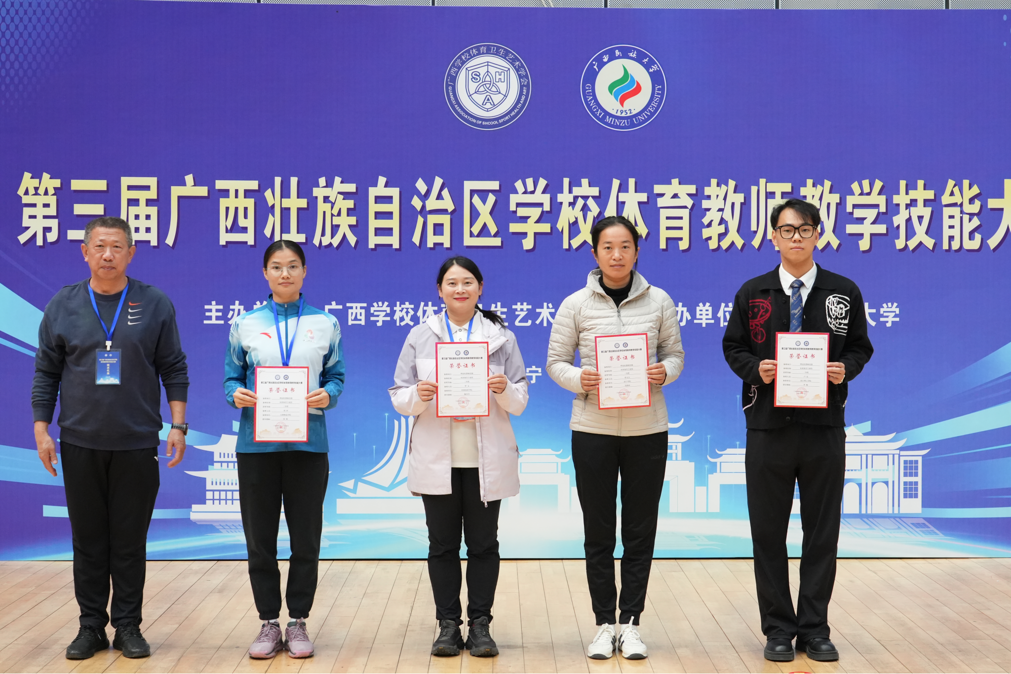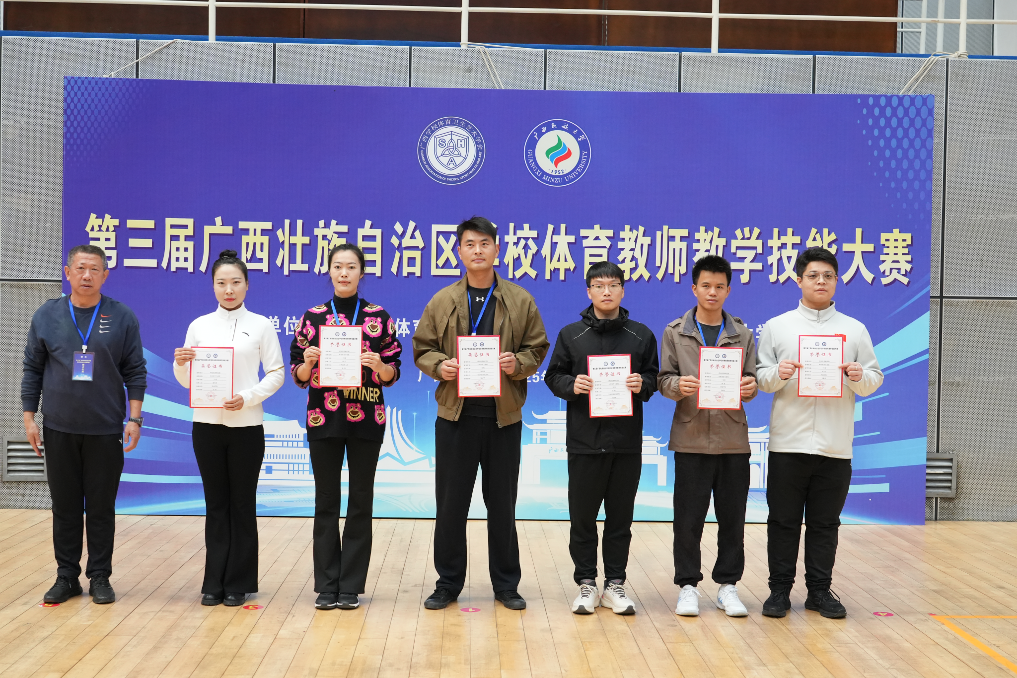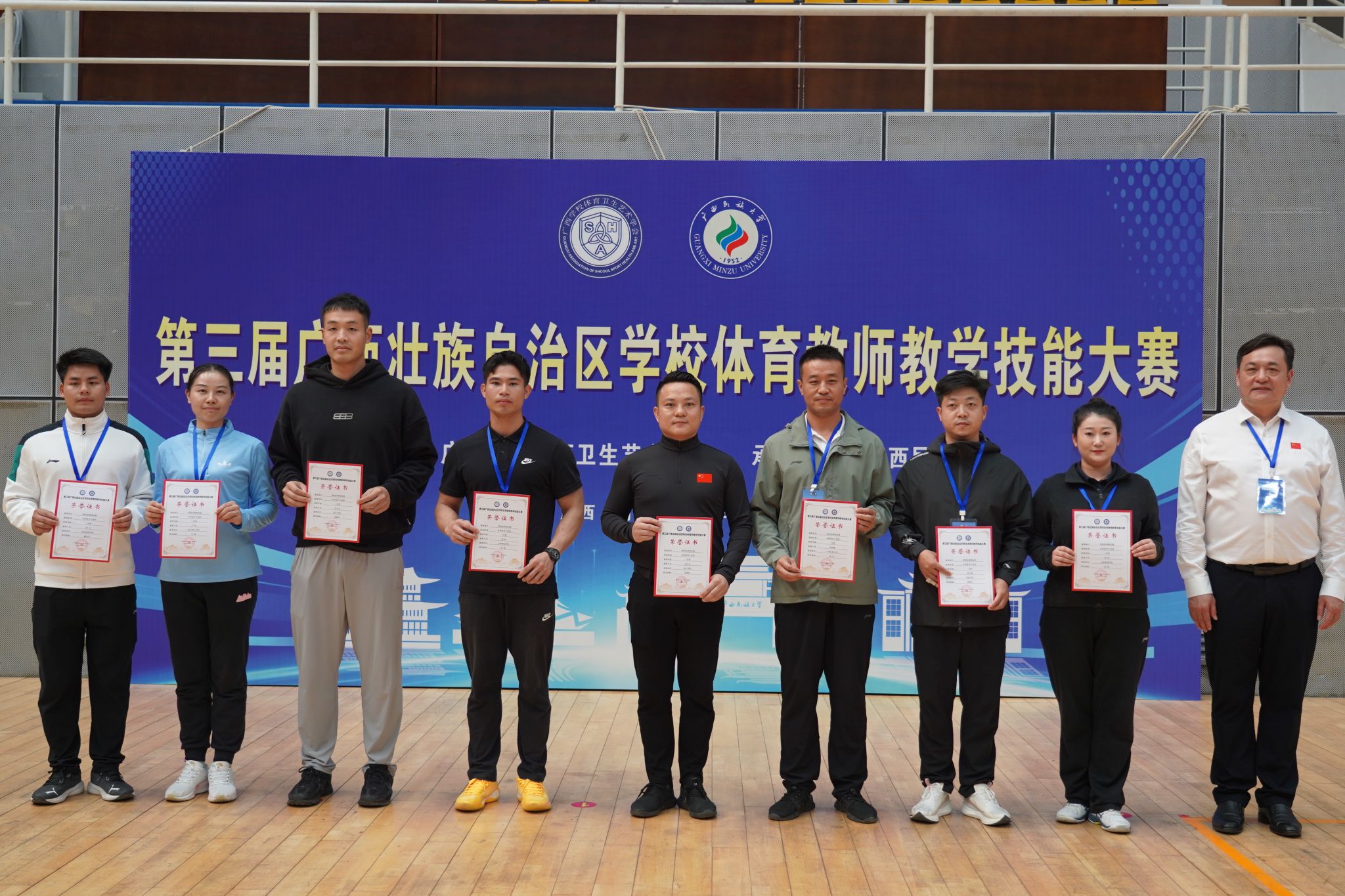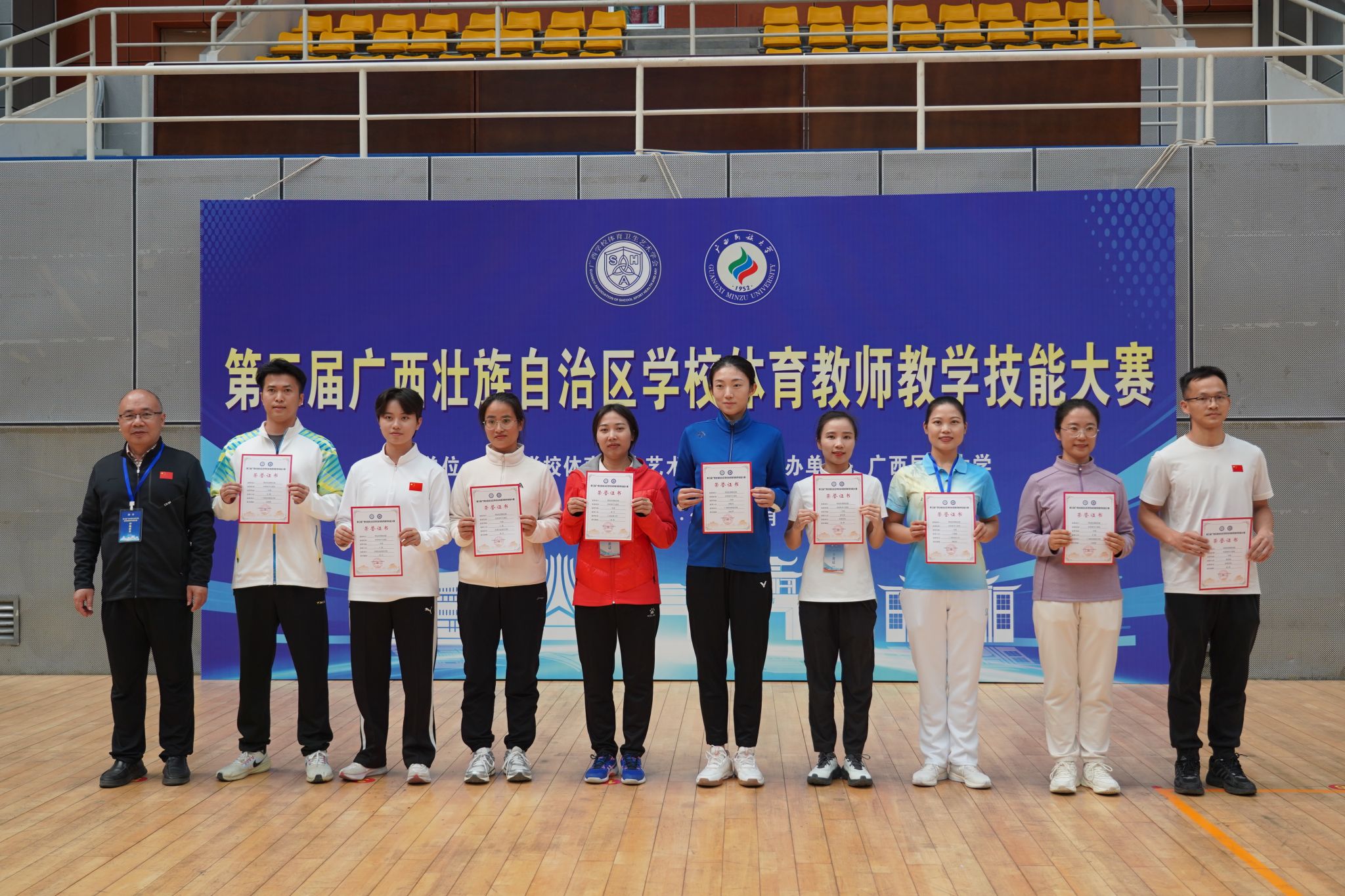 闭幕式上,与会领导为获奖教师颁奖,并对本次大赛的成功举办及教师们的出色表现表示肯定。本次大赛不仅为全区体育教师提供了高水平的交流学习与能力展示平台,更进一步推动了体育教师队伍专业素养和教学能力的整体提升,对促进广西学校体育教育改革与高质量发展具有积极意义。