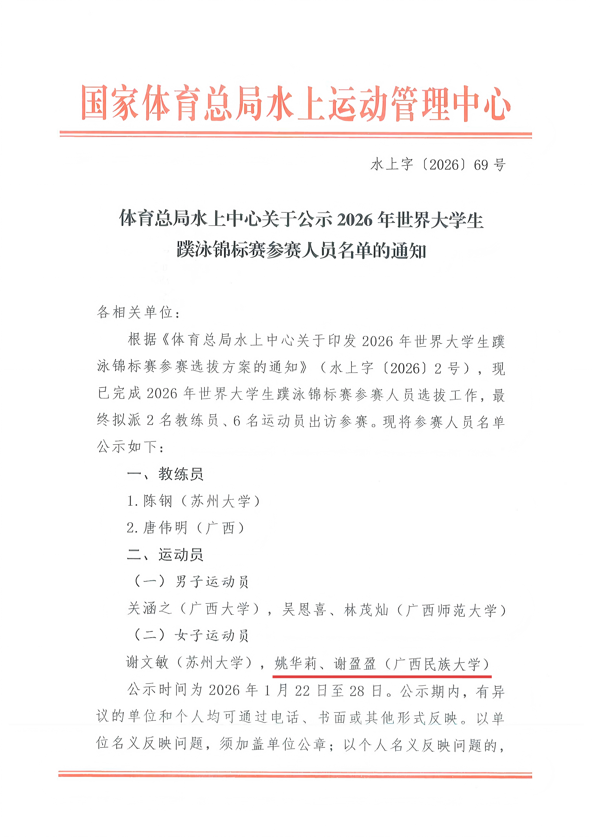 近日,国家体育总局水上运动管理中心公布2026年世界大学生蹼泳锦标赛参赛人员名单。我院2024级运动训练专业学生姚华莉、谢盈盈成功入选,将代表中国参加本届赛事。