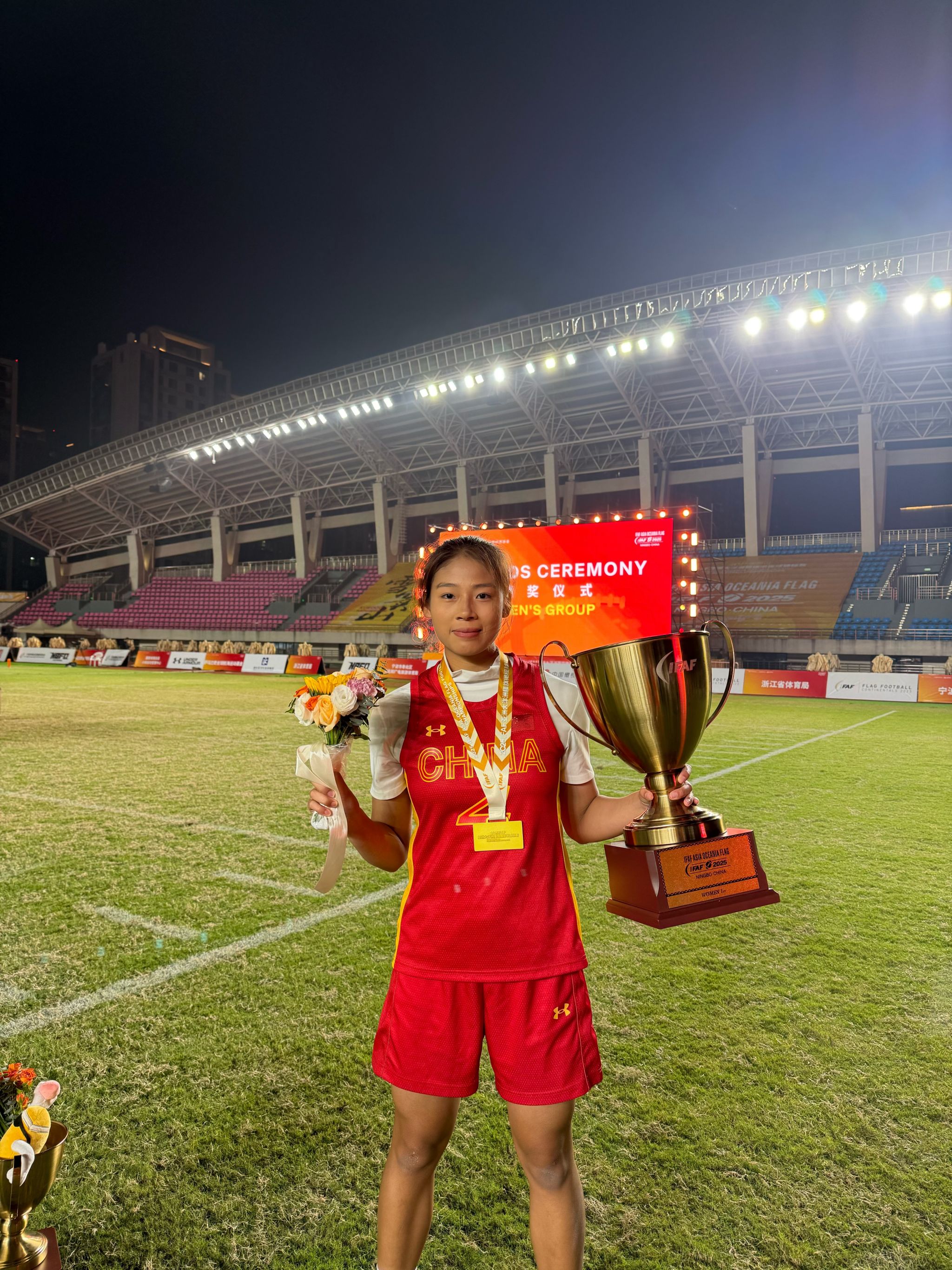 近日,2025IFAF亚洲大洋洲腰旗橄榄球锦标赛在宁波奉化体育中心圆满落幕。我院2024级运动训练专业学生曾思盈作为国家队一员,随中国女子腰旗橄榄球队奋勇出战,助力队伍接连斩获亚洲分区冠军及洲际总冠军,并成功夺得2026年德国杜塞尔多夫世锦赛参赛资格!